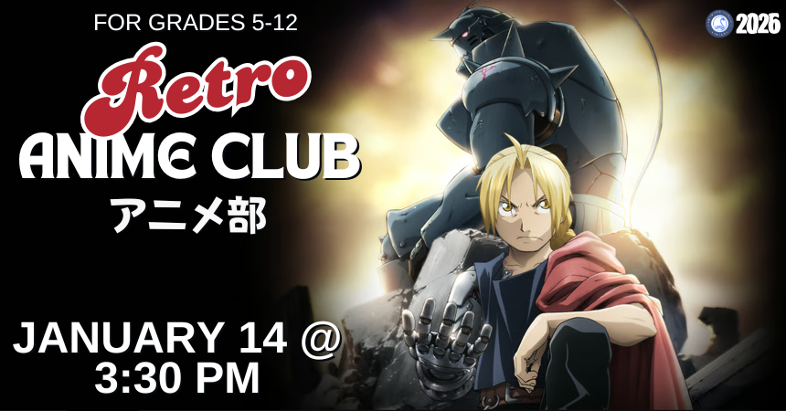 Wednesday, January 14, 2026 | 3:30 to 5:30pm United States Retro Anime Club: Join us from 3:30 pm to 5:30 pm on Wednesday, January 14, to watch episodes of older (but great!) anime chosen by the attendees. Japanese snacks included! Audience Teens
