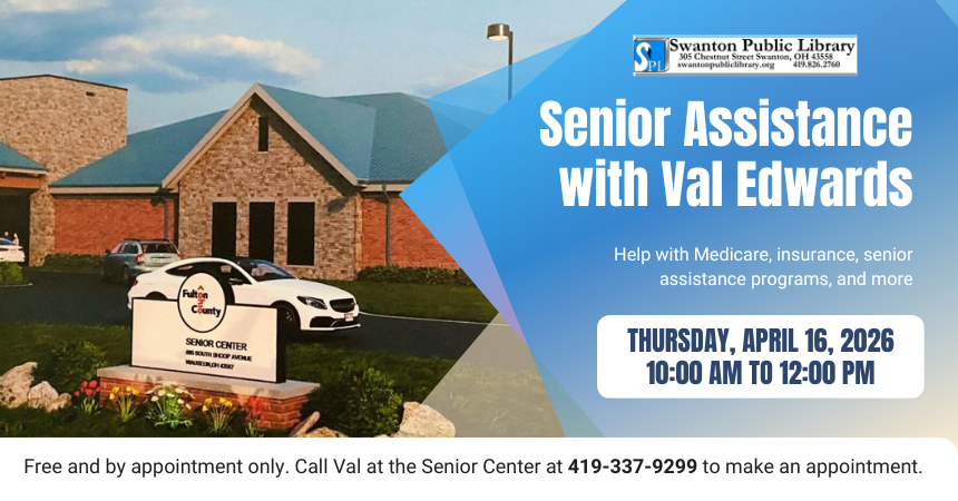 Val Edwards from the Fulton County Senior Center will help walk you through topics such as Medicare, senior assistance programs, insurance, and more! Call the Senior Center at 419-337-9299 to schedule an appointment on Thursday, April 16 between 10:00 am and noon.